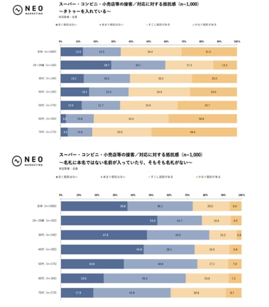 スーパーやコンビニ、小売店等で以下の接客を受けたり、以下のような店員を見かけたりした場合、どの程度抵抗感を覚えるかをお聞きしました。