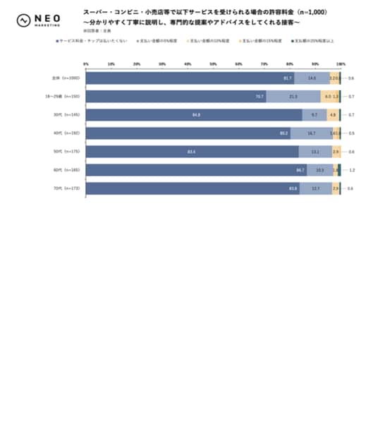 スーパーやコンビニ、小売店等で、以下のような接客サービスが受けられるとしたら、サービス料金としていくらまでなら許容できるかをお聞きしました。