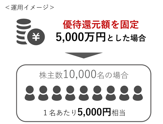 「シェア型株主優待」は、導入企業があらかじめ優待還元額を確定し、対象株主で等しく分け合う仕組みです。従来の優待制度では、株主数の増加などにより想定を上回る優待還元額が発生し、結果として内容変更や制度自体の廃止に至った事例も見られました。本施策では、株主数の増減にかかわらず、優待還元を固定できるため、持続的な株主還元を実現します。