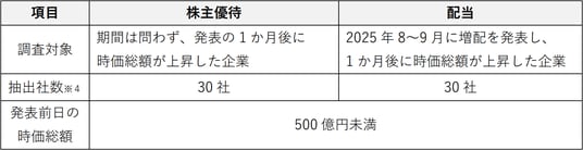 時価総額500億円未満の企業は、個人投資家比率が一般的には高いと言われているため、優待制度の有無が投資判断に直結しやすく、優待導入が新規の個人投資家を呼び込みやすい構造にあると考えられます。この点が配当と比較した投資対効果の優位性につながっているものと思われます。
