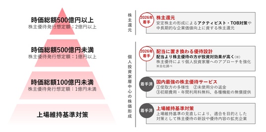 なお、我々は、時価総額500億円以上の企業における株主優待施策として安定株主の創出を通じて中長期的な企業価値向上に資するプロダクト開発を引き続き検討してまいります。