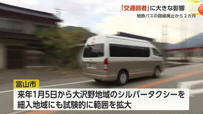 こうした状況を受け、細入地域の自治会連合会は富山市に対しコミュニティバスなど代わりの移動手段を要望。富山市は来年1月5日から、これまで大沢野地域が対象だったシルバータクシーを細入地域にも試験的に範囲を拡大することを決めた。