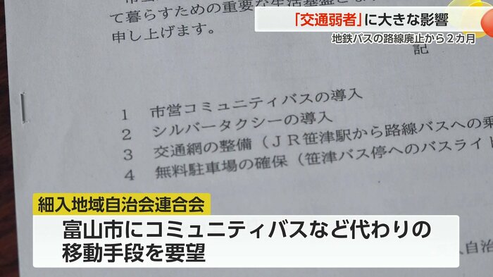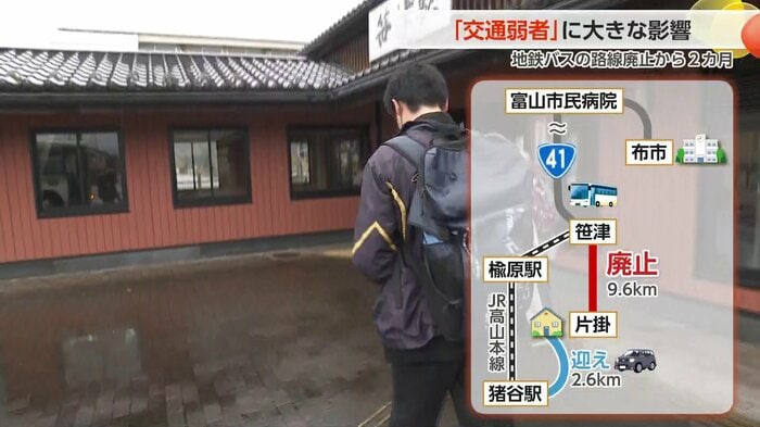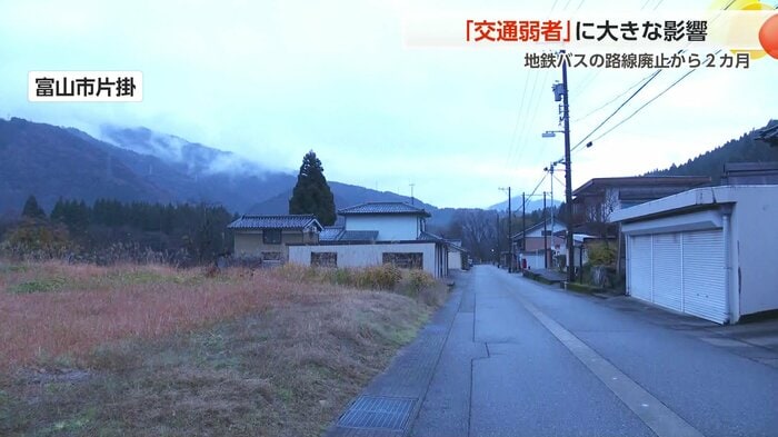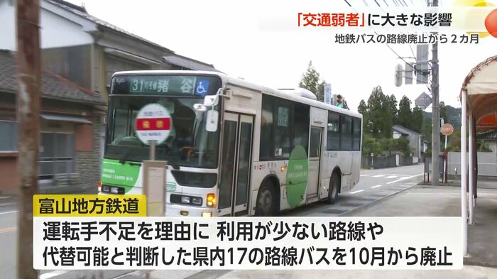 富山地方鉄道が「運転手不足」を理由に17路線のバスを廃止してから2か月が経過した。車を運転できない高齢者や高校生などの「交通弱者」が大きな影響を受けている細入地域の現状を取材した。