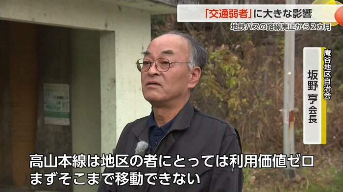 庵谷地区には38世帯、79人が暮らし、高齢者も多いが、地域の足だった路線バスはもう来ない。JR高山本線が代替手段として挙げられているが、庵谷地区自治会の坂野亨会長は厳しい現実を指摘する。