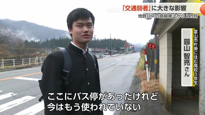 富山市の中心市街地から20キロ以上離れた富山市細入地域の片掛。この地域に住む高校3年生の圓山智亮さんは、使われなくなったバス停を見て語る。