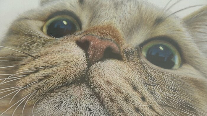 もふもふの毛並みに丸く澄んだ瞳、今でも動き出しそうなリアルな表現。色鉛筆で描く技巧がSNSでも多くの注目を集める若手作家、音海はるさんの作品です。