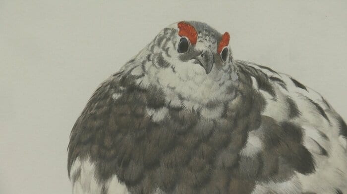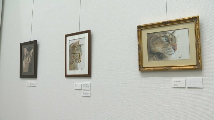 会場には音海さんがモチーフにしている猫をはじめ、犬やトラなどを描いた33の作品が展示され富山にちなんだ新作のライチョウを描いた作品もあります。