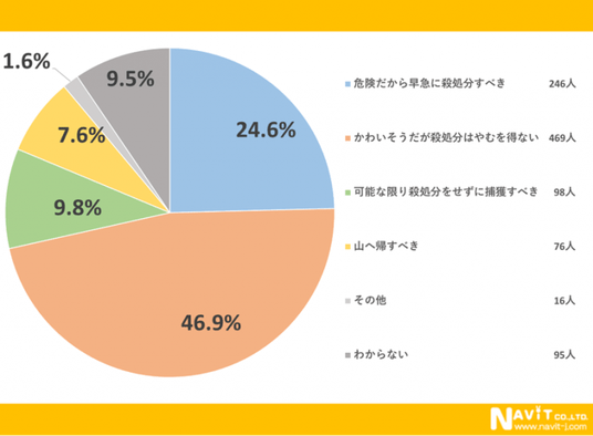 クマに対する対処法として何が適切かについてのアンケートでは「かわいそうだが殺処分はやむを得ない」と回答された人が一番多く46.9%で、次に多かったのが「危険だから早急に殺処分すべき」と回答された人が24.6%という結果になりました。