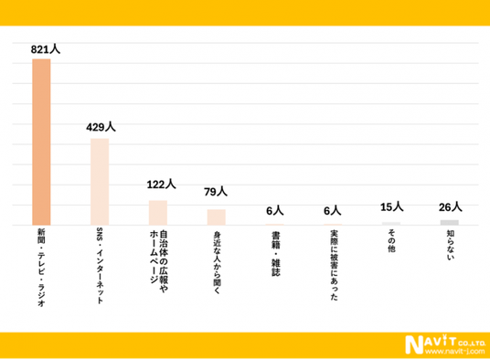 クマ被害を知る情報ソースについて複数回答で回答をいただきました。「新聞・テレビ・ラジオ」が一番多く821人で、次に多かったのが「SNS・インターネット」が429人という結果になりました。