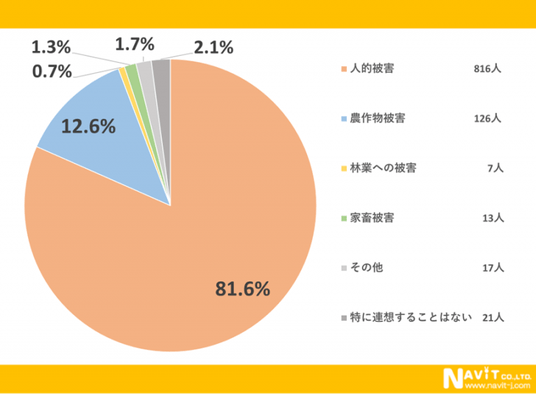 クマの被害で連想することについてのアンケートです。一番に連想されるのは「人的被害」で81.6%という圧倒的に多数という結果になりました。次に「農作物被害」が12.6%で「家畜被害」が1.7%と続いています。