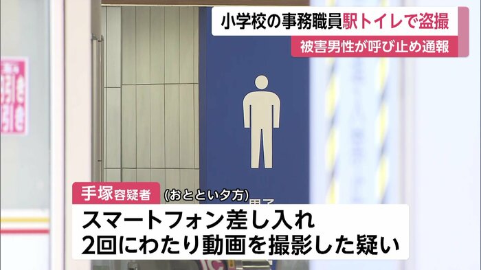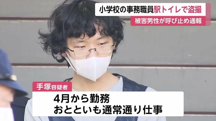 船橋市立塚田小学校の事務職員・手塚陽仁容疑者(21)は4日夕方、船橋市の東葉高速鉄道飯山満駅の男子トイレで、男性(40代)が利用していた個室に扉の上からスマートフォンを差し入れ2回にわたり動画を撮影した疑いが持たれている。