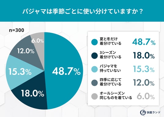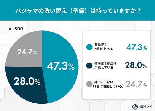 朝晩の寒暖差が大きくなるこの季節、寝付きや睡眠の質を左右する「パジャマ選び」に注目が集まっています。快眠グッズ紹介サイト「快眠ランド」を運営する「ムーンムーン株式会社」は、全国の男女300名を対象に「パジャマの所有枚数・季節別の使い分け・買い替え頻度」に関する調査を実施しました。その結果、「2着~4着で着回す人」が全体の半数近くを占め、さらに 78.7%が季節に応じて着分けている ことが判明。パジャマは“ただ寝るための服”ではなく、気温・快適さ・衛生面に合わせて使い分ける日常アイテムとして定着している様子がうかがえます。