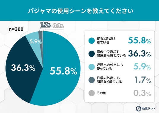 →「寝る専用」として使う人が多い一方、部屋着との兼用も約4割。外出に利用する人は少数にとどまり、用途は主に“睡眠特化”となっています。