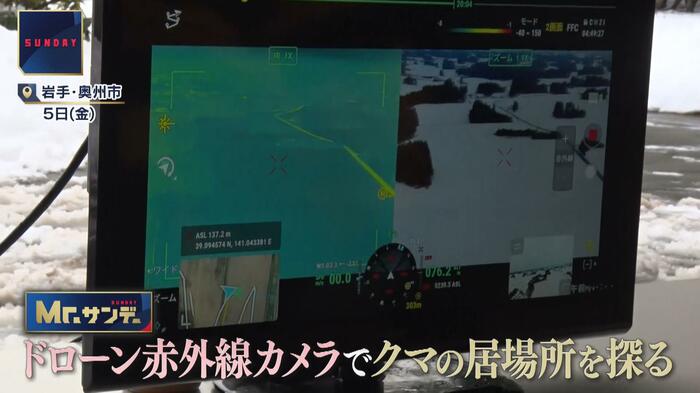 Mr.サンデーは、ドローンオペレーター協力のもと、温度を感知できる赤外線カメラでクマの居場所を探った。