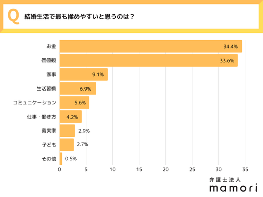 - 結婚生活で最も揉めやすい項目は「お金」と「価値観」