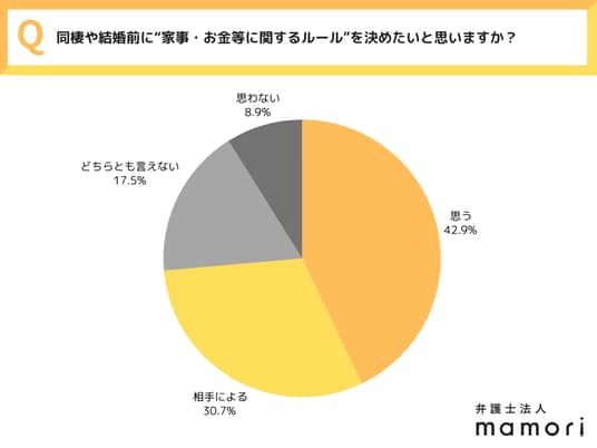 結婚や同棲を前に、家事やお金のルールを決めたいと考える人が一定数いることから、多くのカップルが生活を始める前に将来の不安や摩擦を意識していることが分かります。これは恋愛感情だけで生活が成り立つのではなく、日常の細かい調整や責任の分担が重要であるという現実的な視点が、若年層でも広く浸透していることを示しています。加えて、ルールの必要性を感じつつも決めきれない人がいることは、心理的な抵抗や相手への遠慮が存在することを示唆しており、意識の高さと行動のギャップが課題であると言えます。