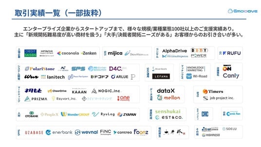 特に、「大手企業~スタートアップ企業の決裁者開拓」に強みを持っており、これまで様々な業種業界、規模感のお客様とお取引をさせていただいております。