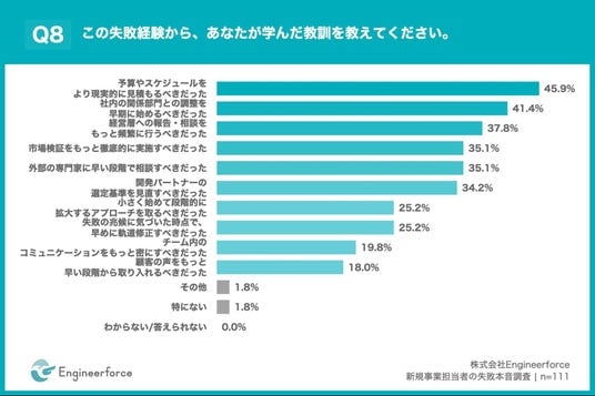 「Q8. この失敗経験から、あなたが学んだ教訓を教えてください。(複数回答)」(n=111)と質問したところ、「予算やスケジュールをより現実的に見積もるべきだった」が45.9%、「社内の関係部門との調整を早期に始めるべきだった」が41.4%、「経営層への報告・相談をもっと頻繁に行うべきだった」が37.8%という回答となりました。