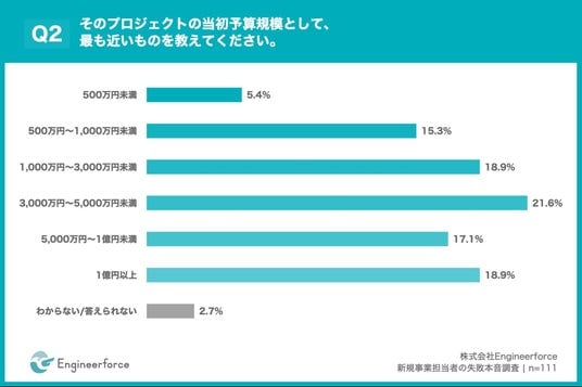 「Q2. そのプロジェクトの当初予算規模として、最も近いものを教えてください。」(n=111)と質問したところ、「3,000万円~5,000万円未満」が21.6%、「1,000万円~3,000万円未満」が18.9%、「1億円以上」が18.9%という回答となりました。