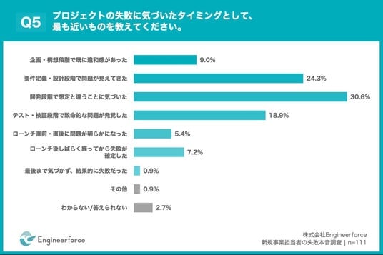 「Q5. プロジェクトの失敗に気づいたタイミングとして、最も近いものを教えてください。」(n=111)と質問したところ、「企画・構想段階で既に違和感があった」が9.0%、「要件定義・設計段階で問題が見えてきた」が24.3%という回答となりました。