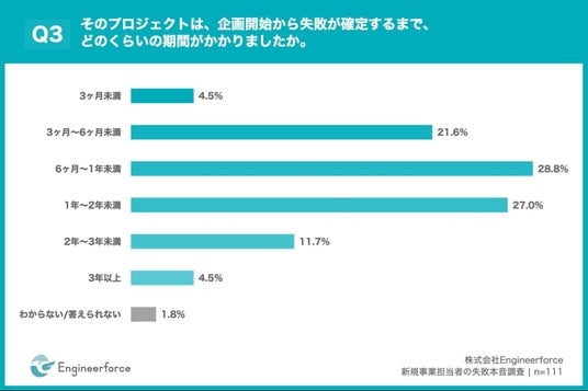 「Q3. そのプロジェクトは、企画開始から失敗が確定するまで、どのくらいの期間がかかりましたか。」(n=111)と質問したところ、「3ヶ月未満」が4.5%、「3ヶ月~6ヶ月未満」が21.6%という回答となりました。・3ヶ月未満: 4.5%