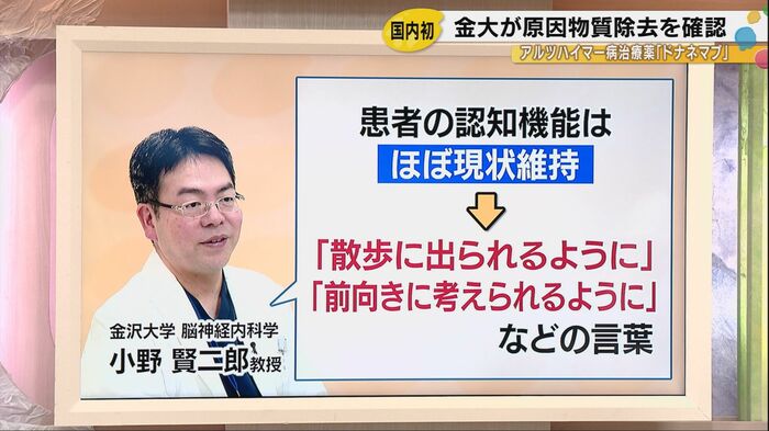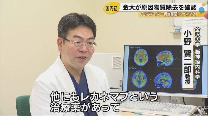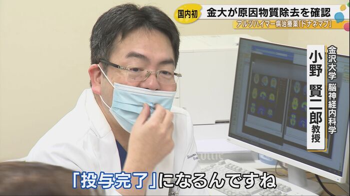 金沢大学は、新たなアルツハイマー病治療薬「ドナネマブ」の投与により、患者の脳内でアルツハイマー病の原因物質が除去されたことを国内で初めて確認した。治療を担当した金沢大学脳神経内科学の小野賢二郎教授は「1年間頑張ってやっていただいて、今回プラーク(原因物質)の除去を確認されたということで、投与を完了になるんです」と述べ、患者に治療確認証を手渡した。