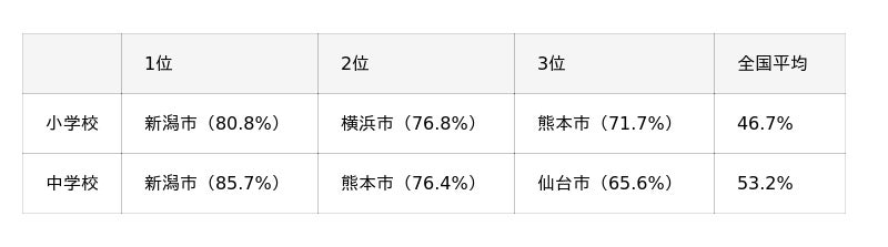 - 出典:文部科学省「令和7年度 全国学力・学習状況調査」児童生徒質問紙調査(政令指定都市別の公表結果)- 分析対象:ロイロノート・スクールを導入している6つの政令指定都市(仙台市・横浜市・新潟市・名古屋市・京都市・熊本市)