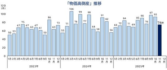 物価高倒産は74件判明 2025年1-11月の累計は879件