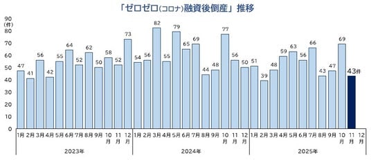 「ゼロゼロ(コロナ)融資後倒産」は、43件(前年同月56件、23.2%減)判明し、7カ月連続で前年を下回った。業種別にみると、『小売業』が14件で最も多く、『製造業』が10件、『建設業』『卸売業』が各7件で続いた。2025年1-11月の累計は584件となり、前年同期(685件)を14.7%下回るペースで推移している。