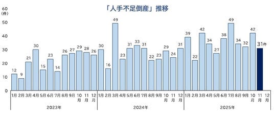 ■ 「人手不足倒産」は31件判明し、2025年1-11月の累計は390件となった