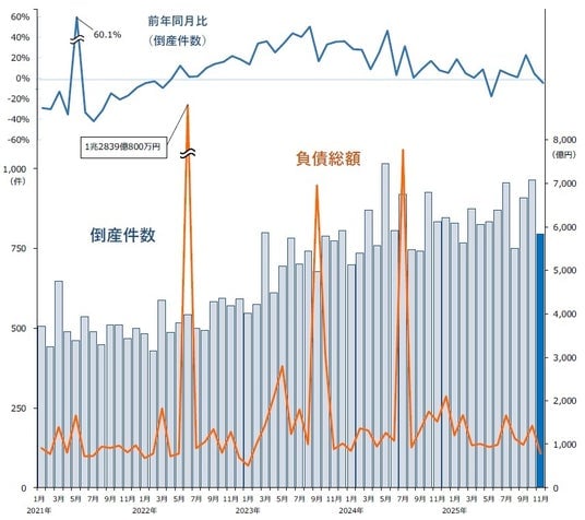 株式会社帝国データバンクは、2025年11月の企業倒産件数(負債1000万円以上の法的整理が対象)について集計し、分析を行った。