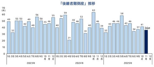「後継者難倒産」は、36件(前年同月46件、21.7%減)判明し、3カ月連続で前年を下回った。業種別にみると、『卸売業』が9件で最も多く、『建設業』『サービス業』が各7件、『製造業』が5件で続いた。2025年1-11月の累計は461件となり、前年同期(501件)を8.0%下回った。