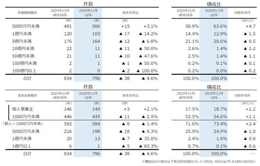 資本金を規模別にみると、『個人+1000万円未満』の倒産が584件(前年同月592件、1.4%減)となり、11月としては前年に次ぎ2000年以降で2番目に多かった。