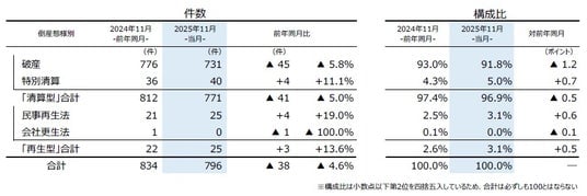『清算型』では、「破産」が731件(前年同月776件、5.8%減)で最も多く、全体の91.8%を占めた。「特別清算」は40件(同36件、11.1%増)で2カ月ぶりに前年を上回り、11月としては2000年以降で3番目に多かった。