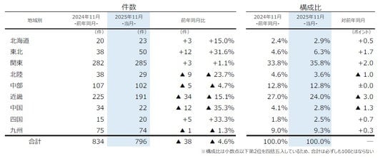 地域別にみると、9地域中5地域で前年を下回った。『近畿』(前年同月225件→191件、15.1%減)は3カ月ぶりに前年を下回った。特に「大阪」(同123件→81件)の減少が目立った。一方、『関東』(同282件→285件、1.1%増)は6カ月連続で前年を上回り、11月としては過去10年で最多となった。