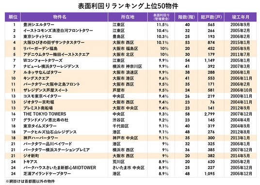 最も表面利回りが高かったのは、江東区の「豊洲シエルタワー」で表面利回り11.5%でした。ランキング上位50物件(同率のため実際は52物件)の中で表面利回りが10%を超えたのは6物件、9%台が17物件、8%台が29物件あり、上位の物件は総じて高い利回りになりました。