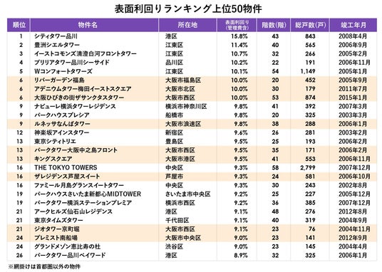 最も表面利回りが高かったのは、江東区の「シティタワー品川」で表面利回り15.8%でした。ランキング上位50物件(同率のため実際は52物件)の中で表面利回りが10%を超えたのは8物件、9%台が17物件、8%台が27物件あり、上位の物件は総じて高い利回りになりました。