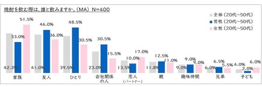 焼酎は家族、友人と一緒に飲むことに次いで、ひとりで飲む傾向も高い。全体でみると「家族」、「友人」、「ひとり」で飲むことが多い結果に。ただし、女性は「家族」と飲むが51.5%で最も多く、男性は「ひとり」で飲むが48.5%と最多でした。男女間で飲酒スタイルに大きな違いが見られました。