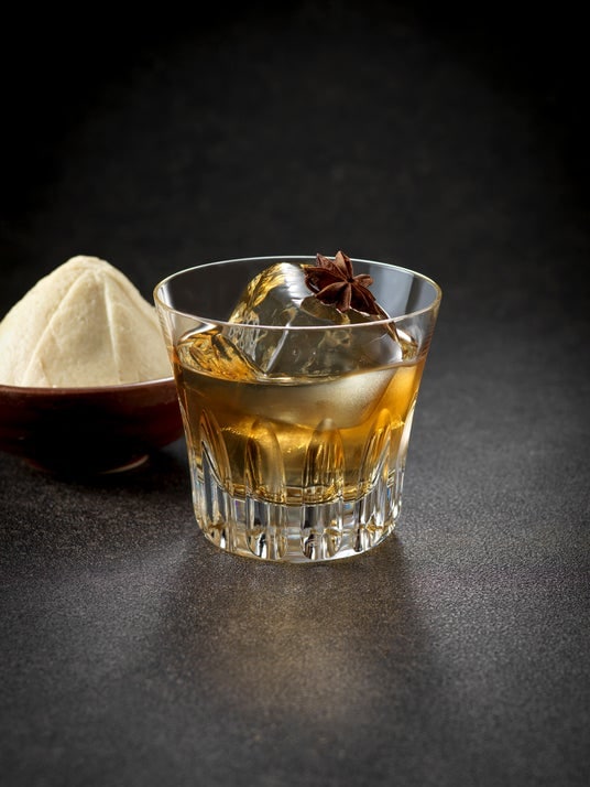1. 大き目のワイングラスに大きな氷を1つ入れ、Aを注ぐ。