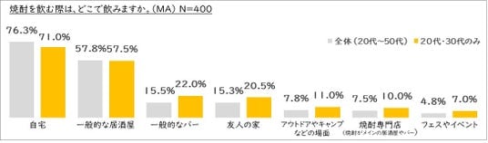 焼酎を自宅や居酒屋で飲むことが多い一方で、20代、30代ではバーや友人の家で飲む人も約2割と、全体割合よりも高い傾向でした。またアウトドアやキャンプ、フェスなどのイベント時にも飲用する機会が多い結果となりました。