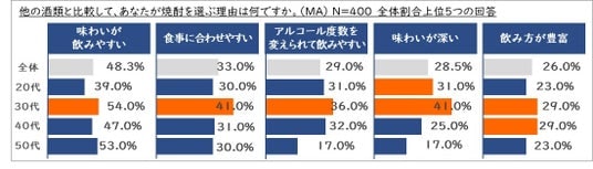 焼酎を選ぶ理由上位は「味わいが飲みやすい」、「食事に合わせやすい」と食中酒としてのポジショニングが強い傾向。
