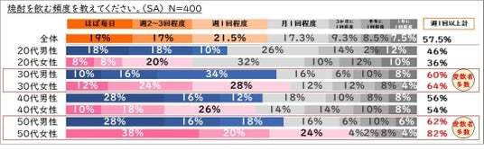 - 【「本格焼酎・泡盛の飲用調査 2025」全国の20~50代の男女400名対象】30代と50代男女の6割を超える人が週1回以上飲用。さらに50代女性の約4割が「ほぼ毎日」と回答。