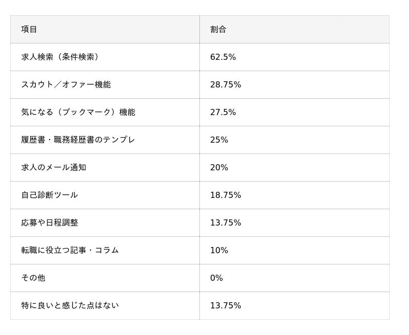 - 転職サイトの良い点としては「求人検索の使いやすさ」が最も支持された一方、改善点では「求人の質」や「検索しづらさ」が挙げられ、情報の精度や検索体験に対するニーズが高いことが明らかになりました。