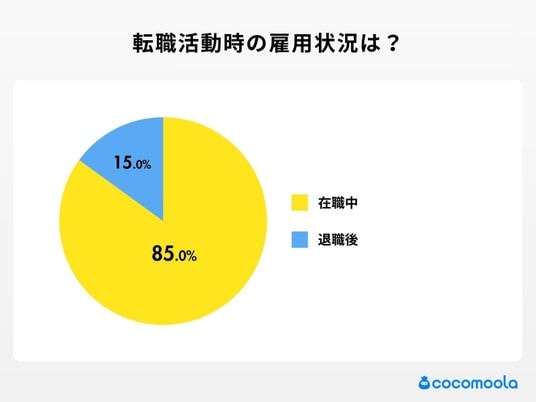 - 転職活動は「在職中」に進める人が85%と大多数で、仕事と並行して情報収集・応募を進めるスタイルが一般的であることが分かりました。