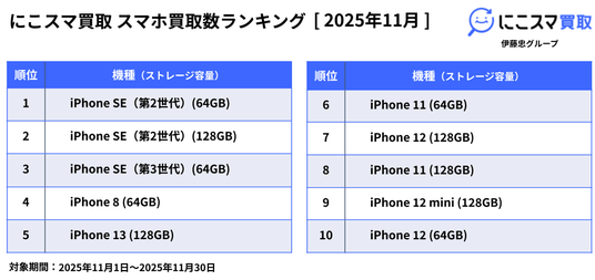 買取数ランキングでは、提携しているAmazon.co.jpで開催された「Amazon ブラックフライデー 2025(2025年11月24日~12月1日)」の影響もあり、「にこスマ買取」全体で取引数が40%ほど増加する中、前月から引き続き、iPhone SE(第2世代)の64GBモデルと128GBモデルが、それぞれ1位と2位にランクインしました。