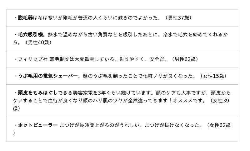 女性では、「ヘアードライヤー」「ヘアーアイロン」「電気シェーバー(うぶ毛・眉毛用)」が上位3位です。男性では「ヘアードライヤー」に続き、「鼻毛シェーバー」が2位となっています。