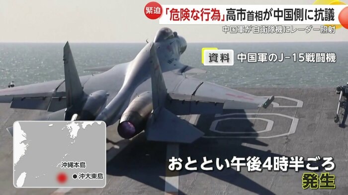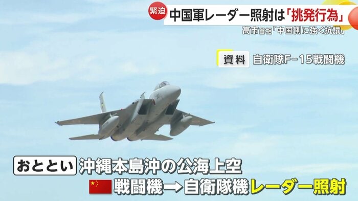 6日午後、沖縄本島沖の公海上空で、中国軍の戦闘機が自衛隊機にレーダーを照射。