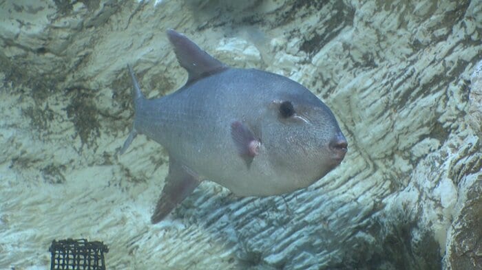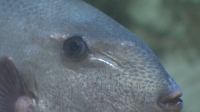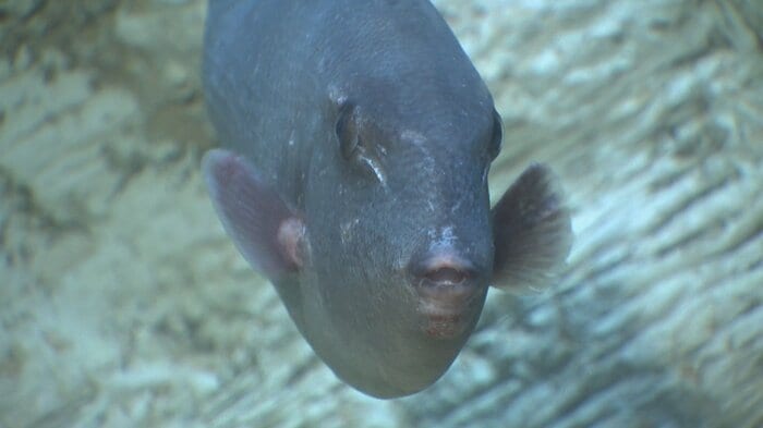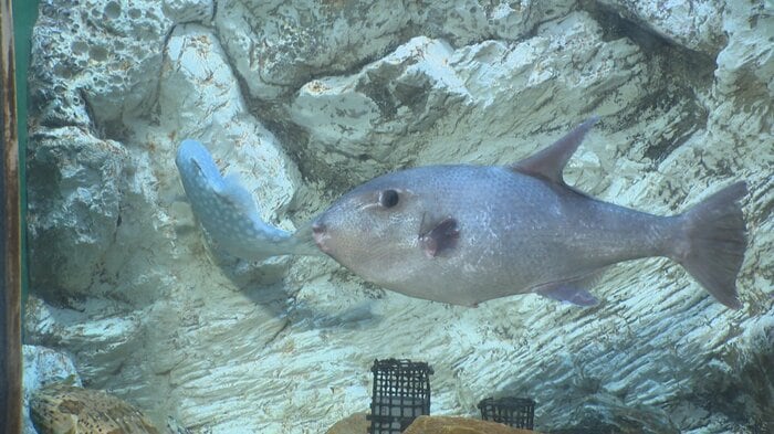 この魚は先月、富山県射水市海老江沖の定置網で捕獲されたもので、体長は約40センチ。水族館が調査したところ、モンガラカワハギ科の「ボウズモンガラ」と確認された。