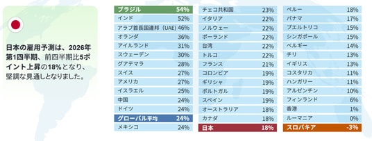 総合人材サービスのマンパワーグループ株式会社(本社・東京都港区、代表取締役社長:池田 匡弥、以下マンパワーグループ)は、2026年第1四半期(1-3月期)における企業の雇用計画を尋ねた「マンパワーグループ雇用予測調査」の結果を発表します。調査結果は「2026年1-3月において、貴社または貴機関の雇用計画(契約社員、派遣社員等を含む)は今期(2025年10-12月)と比べてどのような変化がありますか?」という質問に基づいています。なお、本調査はマンパワーグループが四半期ごとに行っている世界で最も広範囲(実施対象:41カ国・地域)にわたる事前調査です。