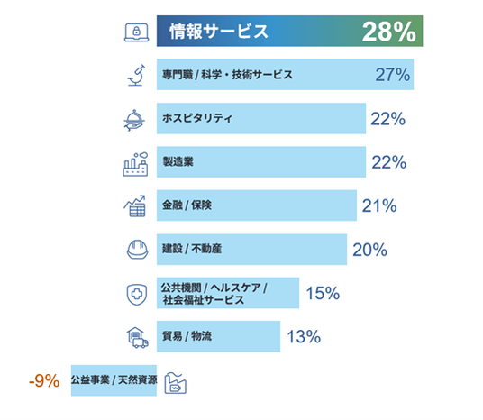 日本国内の業種別調査では、8業種で増員予定となっています。最も活発な雇用活動が期待されるのは「情報サービス」で、前四半期比+3ポイント、純雇用予測は+28%という結果になりました。